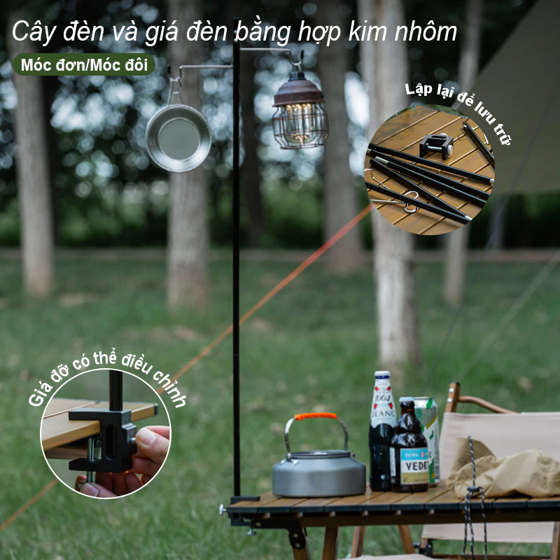 - Giá Treo Đèn Camping Xếp Gọn 270° Xoay: nhỏ gọn, dễ dàng di chuyển, có chức năng kẹp bàn đa năng.