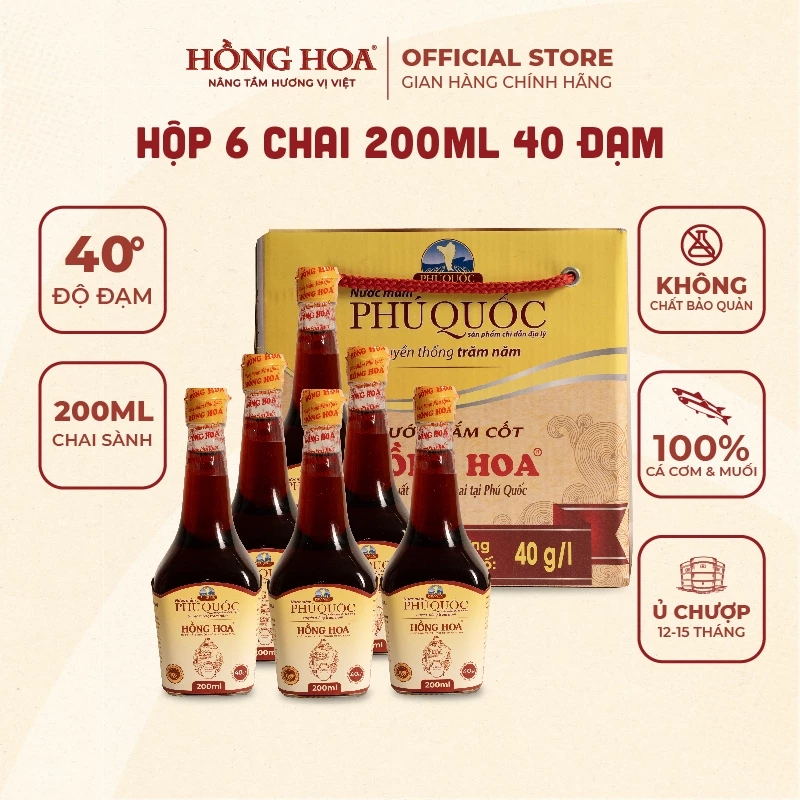🔥 Nước Mắm Phú Quốc Hồng Hoa Hộp 6 chai 40 độ đạm 200ml, Nước Mắm Nhĩ Cá Cơm Truyền Thống đang giảm giá!