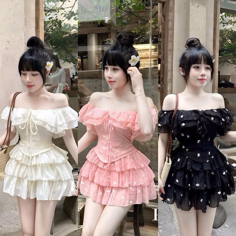 🔥 Set váy thời trang nữ chất tăm gãy trễ vai, tay ngắn bèo ngực có mút ngực dáng váy xoè có lót dự tiệc sang trọng xinh đang giảm giá!